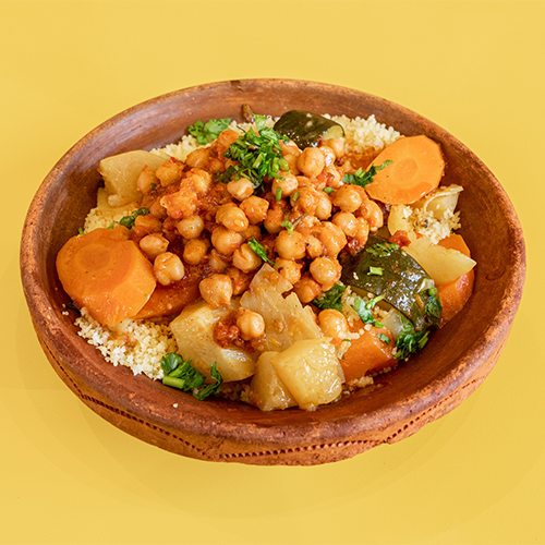 Volkoren couscous, zeven Marokkaanse groenten, rozijnen, kikkererwten en amandelen